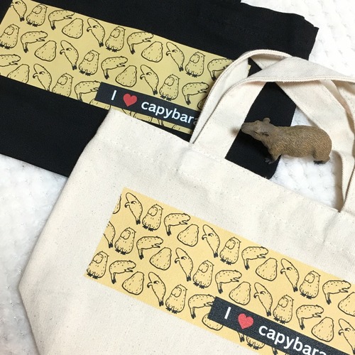 ゆる~いカピバラの大群をあしらった、可愛いミニトートバッグです。 黒字の帯に白抜きの「I love(ハートマークで表現) capybaras!」の文字と、赤いハートマークがアクセント。 カピバラ好きな方はもちろんのこと、そうでない人でもデイリーに使っていただけるデザインに仕上げました。 未だかつてない(!?)、可愛さの中にもスタイリッシュさが漂う、おすすめのミニトートです。 カピ活にはもちろん、通勤・通学のお弁当入れや、ちょっとそこまでのお出かけにどうぞ♪ ※カピバラの置物は非売品です。 サイズ:横幅約28×高さ約18cm、マチ約9cm、持ち手約28cm 素材:コットン、10oz ※新品の状態ではブラックの方が柔らかい手触りになっていますが、どちらも10ozです。